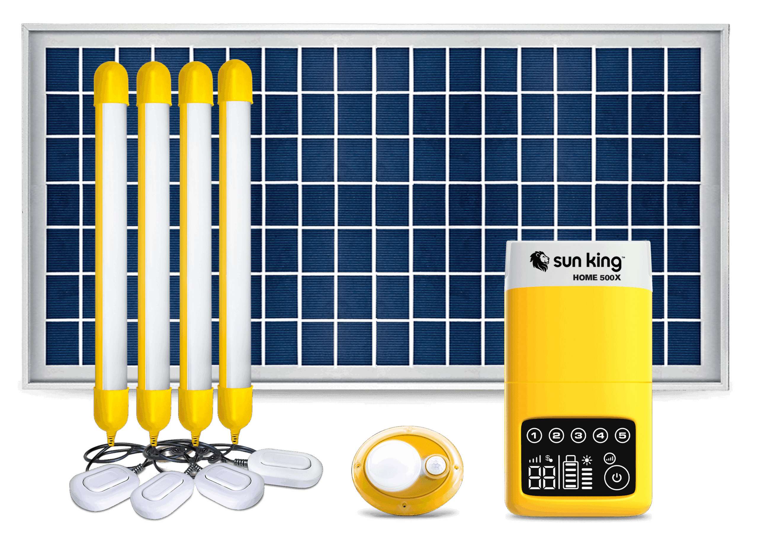 Charge multiple devices and light several rooms with this state-of-the-art solar home system. Combining four 200 lumens tube lights, USB charging for smartphones, and a motion sensor security light, the Home 500X provides businesses and families with essential, reliable lighting and power.